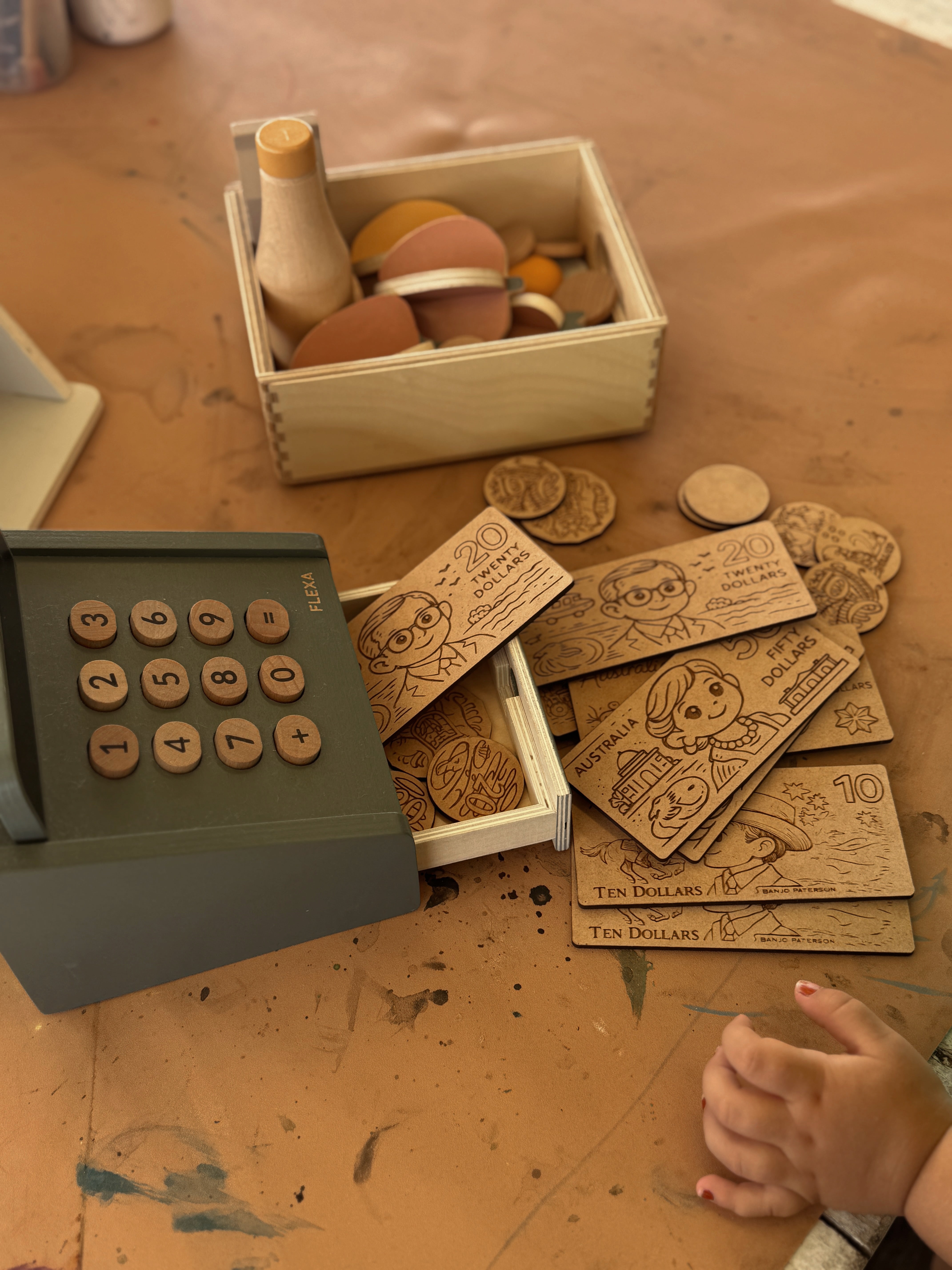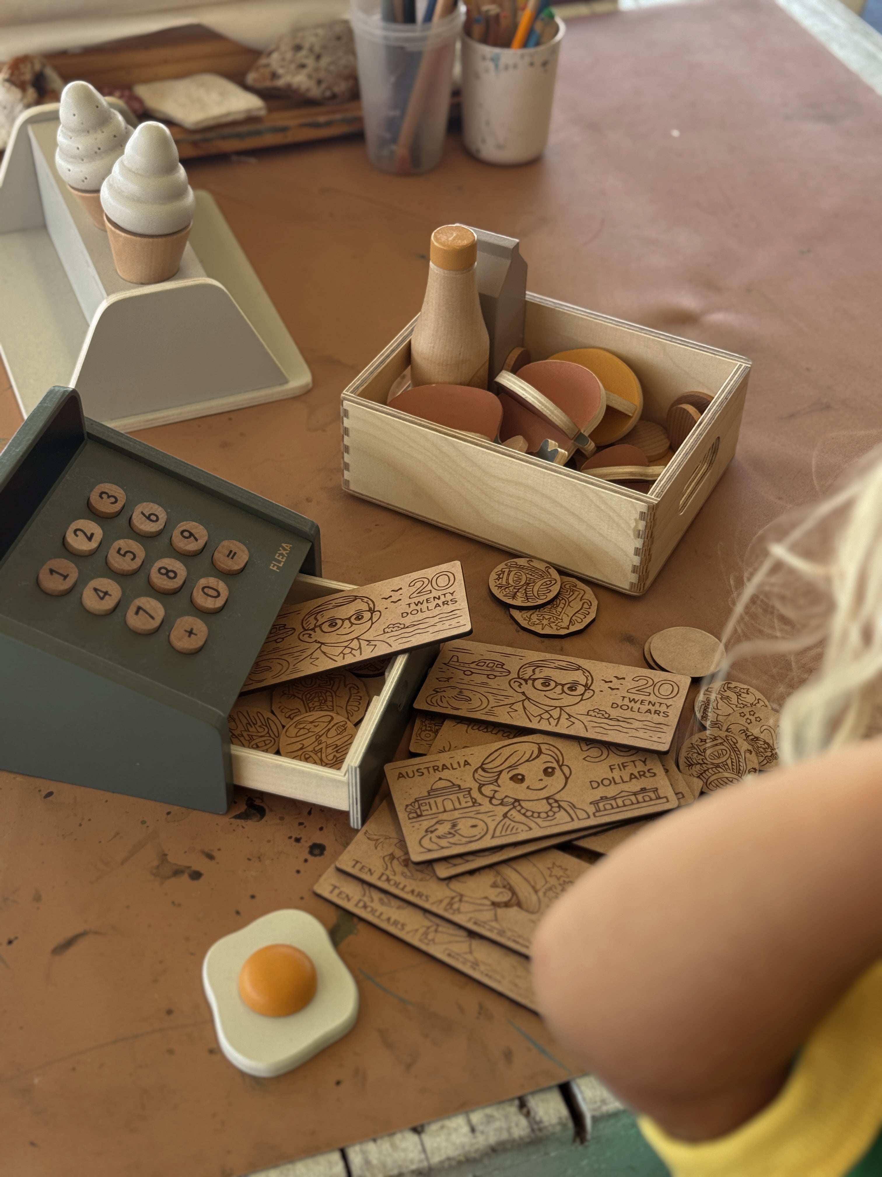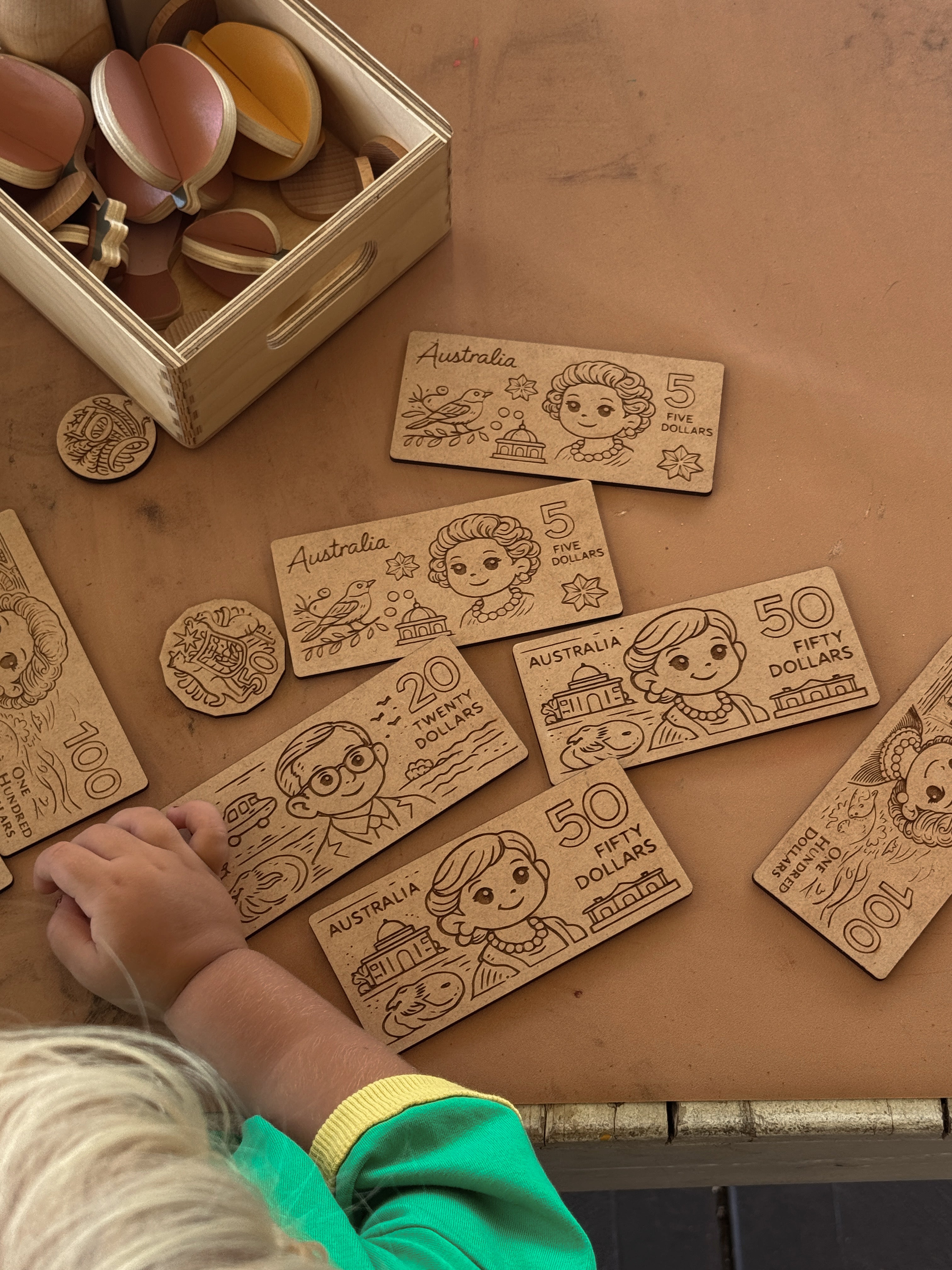 Made from locally sourced sustainable timber, these eco-friendly play money sets help children explore counting, recognising Australian currency, role play, and basic money skills through hands-on, screen-free play.
